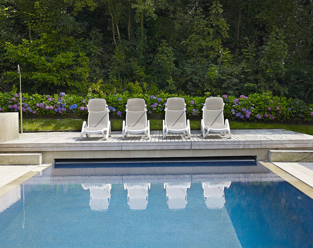 Bain de soleil multipositions Alfa, empilable, en polypropylène renforcé avec de la fibre de verre, avec toile textilène – dossier 4 positions, avec 2 petites roues cachées pour le déplacement; lors de l’utilisation ce bain de soleil repose de façon stable et anti-dérapante sur 4 patins plastiques, 4 ans de garantie.