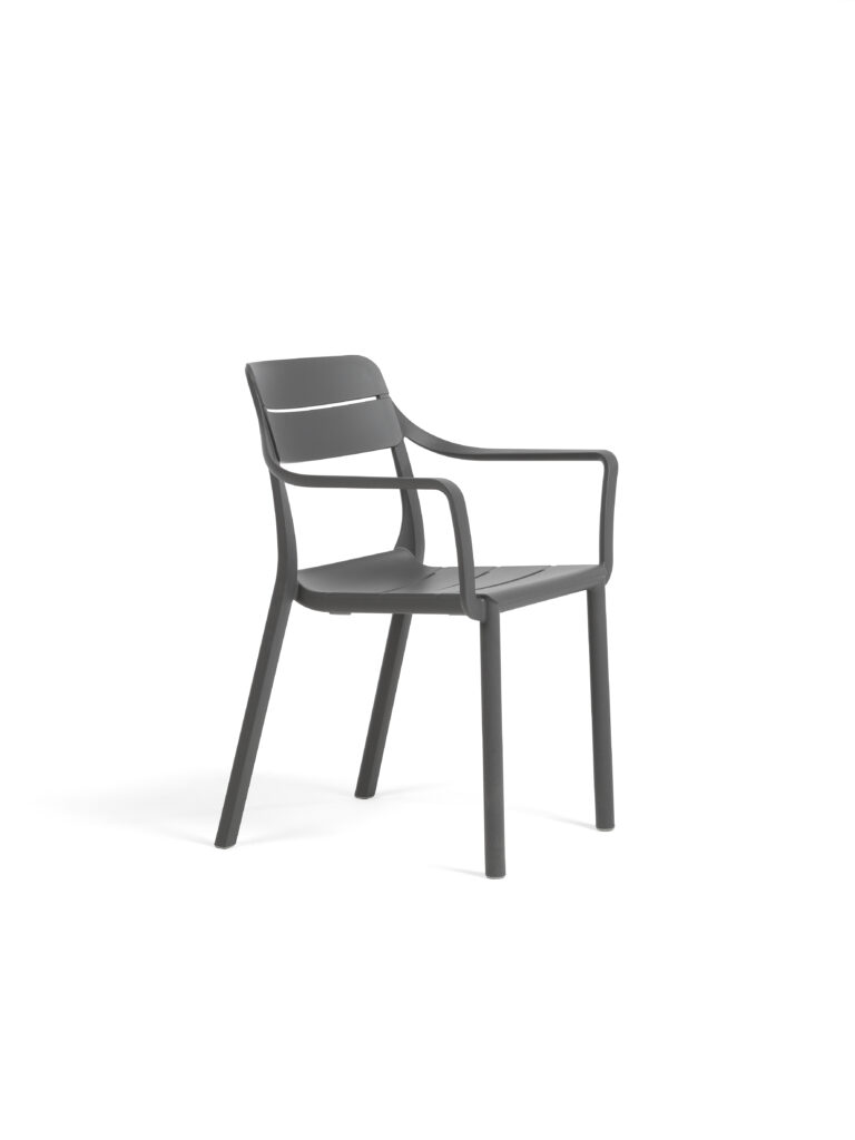 Fauteuil empilable Cassia en polypropylène régénéré haut de gamme, renforcé par de la fibre de verre, traité anti UV et coloré dans la masse, effet mat, avec patins anti-dérapants, résine recyclable, coloris basalte