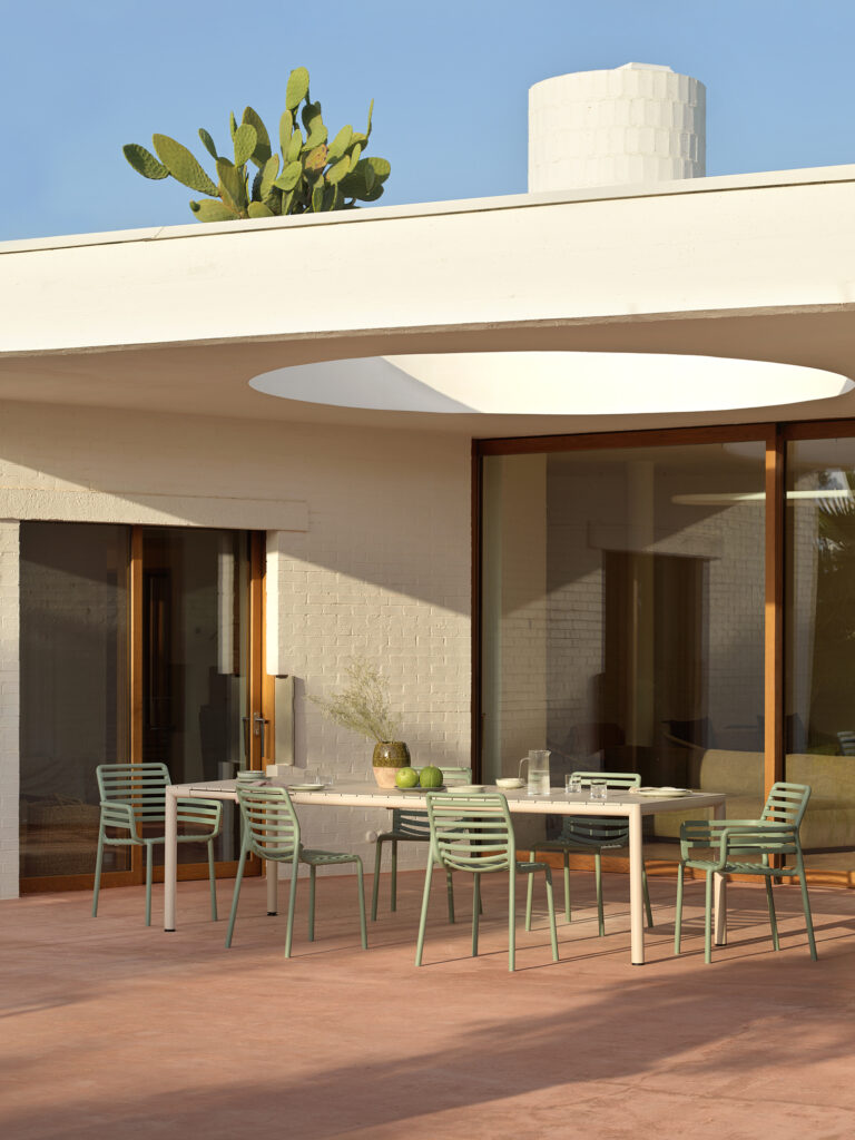 Fauteuil Doga en polypropylène renforcé par de la fibre de verre se distinguant par ses jolies lattes horizontales. Disponible en coloris bianco, antracite, cappuccino, menta, agave, pera, marsala et tabacco.