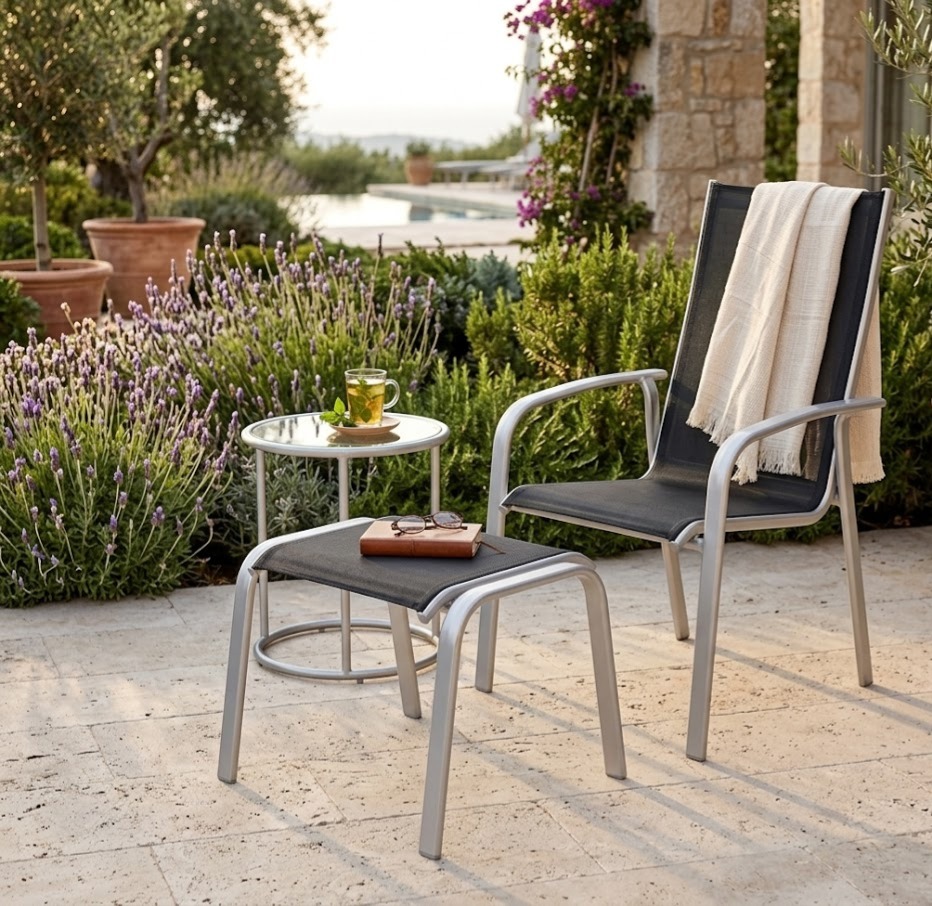 Tabouret/repose-pieds IBIZA en aluminium avec toile haut de gamme Karatex.