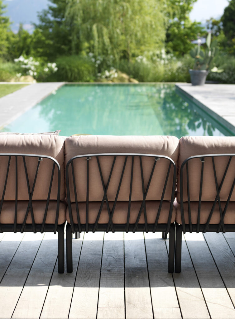 Disponibles dans la gamme modulable Komodo : fauteuil détente, chauffeuse, module d’angle, module avec 1 accoudoir gauche ou droit, pouf, table basse et voile d’ombrage