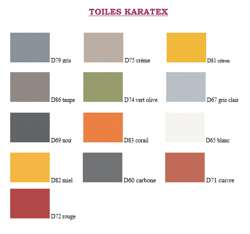 * Karatex est un tissu imprégné spécial, facile d’entretien, résistant aux intempéries et à l’eau et qui s’avère être, grâce à la technologie SmartYan, extrêmement résistante en extérieur et qui empêche sa déformation. Choisissez votre coloris pour votre espace à vivre (de rêve) extérieur. En cas de salissure, un nettoyage à l’eau suffit généralement, par exemple avec un tuyau d’arrosage classique. En cas de salissures plus importante, il convient d’utiliser une éponge ou une brosse souple avec un produit nettoyant au PH neutre. Comme chaque matériau, même sur notre toile Karatex, au fil des années quelques légères décolorations peuvent apparaître, ou par exemple en utilisant des produits chimiques, mais ces décolorations n’altèrent en rien la résistance et les caractéristiques de cette toile.