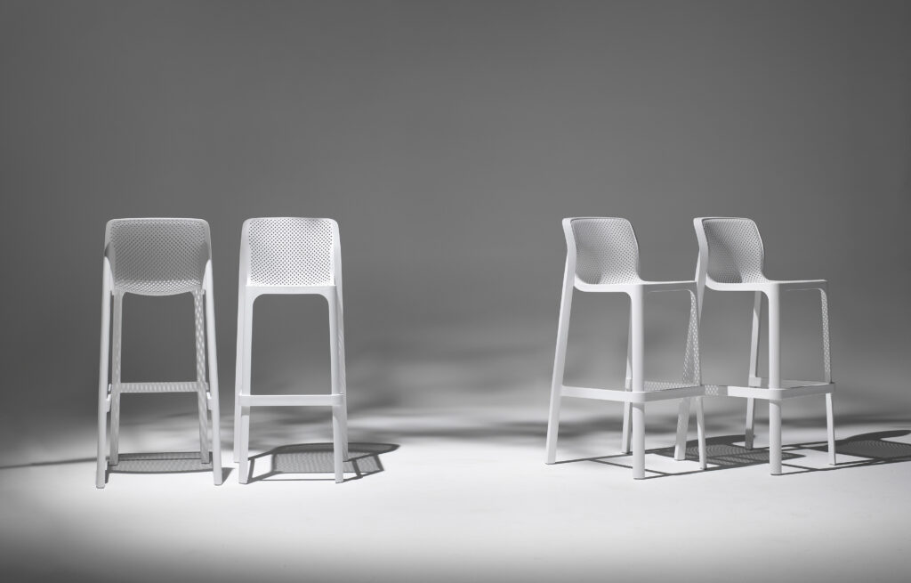 Stapelbarer Barhocker Net aus Polypropylen mit Fiberglas verstärkt, erhältlich in den Farben antracite, bianco, senape, tortora, salice und corallo.