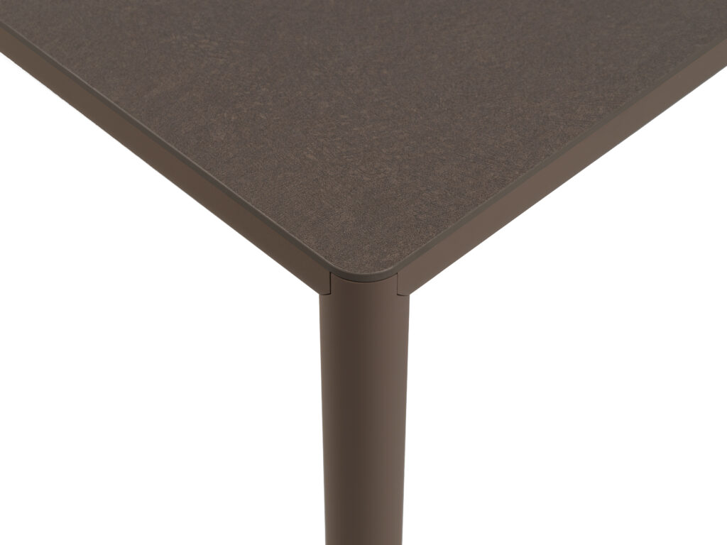 Piètement rond et cadre en aluminium, plateau HPL Solid Core col. tabacco, angles arrondis, avec patins de réglage.