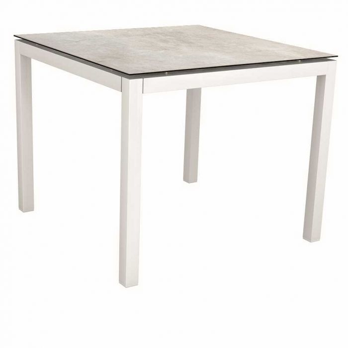 Table Silverstar 90x90cm, cadre et piètement en aluminium col. blanc avec plateau HPL-Silverstar 2.0 col. stone light. Hauteur sous cadre 67cm.