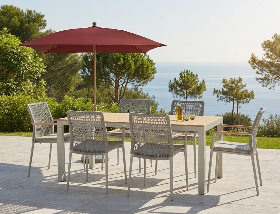 Hochwertiger wasserabweisender Stoff 100% Polyester, sehr widerstandfähig, hohe Lichtechtheit und sehr hoher UV-Schutz. Rottfest.